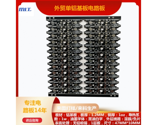 Plate: aluminum substrate, plate thickness: 1.2MM, copper thickness: 1oz, thermal conductivity: 1w, size: 47MM * 10mm, surface treatment: lead-free tin spray, single panel, black oil white font.