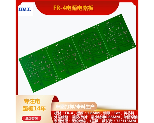 Plate: FR-4, plate thickness: 1.6mm, copper thickness: 1oz, yellow core material, outer circuit: wet film/negative film, minimum drilling nozzle 0.65MM, single side green oil, surface treatment: lead-free tin spraying, 1-layer plate, plate length and width: 73MM * 115MM.