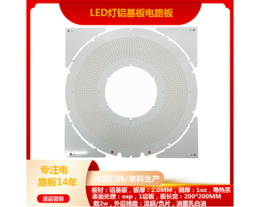 Plate aluminum substrate, plate thickness 2.0MM, copper thickness 1oz, thermal conductivity 2w, outer circuit type: wet film/negative film, plate length: 200 * 200MM, 1-layer plate, surface treatment OSP.